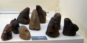 これは、「クド石」です。松山周辺でもカマドのことを「オクドさん」と呼ぶことがありますが、壱岐の人もカマドのことを「クド」と言うそうです。カマドでは鍋などを火にかけて煮炊きしますが、クド石は煮炊きをする際に土器を支える台(脚)として利用されました。
