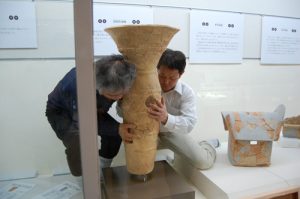 緊迫した状況の中、次は展示ケース内への設置作業です。ハニワが良く見えるように、規模の小さい地震程度では倒れないように設置方法を工夫しながら展示していきます。