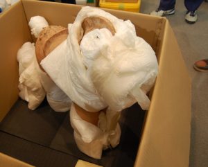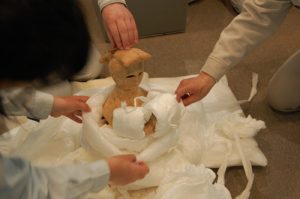 梱包材をていねいに取り外していくと、箱の中から馬形埴輪が見えてきました。