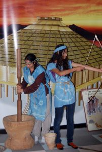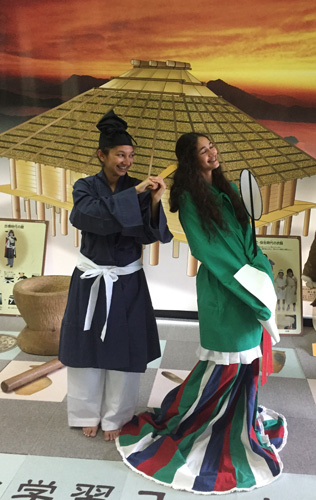 弥生時代の古代衣装(復元品)を着て、はいポーズ!