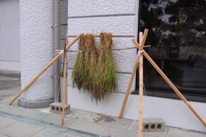「ふんどう君」も石庖丁(いしぼうちょう)をつかって収穫のお手伝いです。