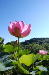 青空に向かってのびるハスの花の姿がとても美しいですね。