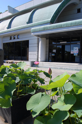 考古館の玄関前で育てている古代ハス。連日、たくさんのお客さんが見に来られます。