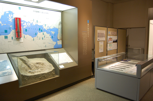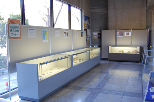 展示会では常設展示室の一部にも展示品をならべますので、ロビーには期間限定で旧石器・縄文時代~弥生時代のコーナーを設置しました。