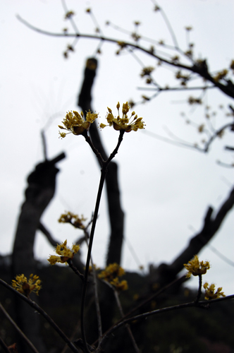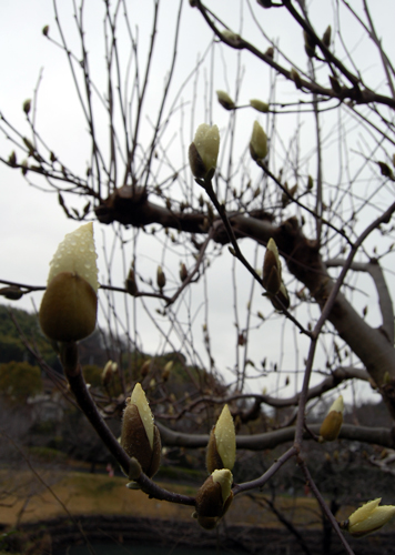 サンシュユの黄色い花が可憐に咲いているほか・・・、モクレンのつぼみもふくらんできました。