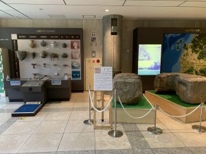 新型コロナウイルス対策を万全にしています。土器クイズと、6月から新しく展示している「来住廃寺からやってきました!謎の石」。の、左手。