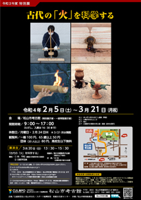 | 3月20日(日)13:30~15:30 演題:『古代の「火」を科学する』 講師:向 平和さん(愛媛大学教育学部 准教授) 定員:60名 聴講:展示会観覧券が必要(高校生以下無料)事前申し込み(抽選):2月15日~3月1日必着 ①電子メールで、件名は「講演会 3月20日」、本文に参加者全員の郵便番号・住所・氏名(ふりがな)・年齢・電話番号を記入して、koukokan@cul-spo.or.jpまで。②ハガキで〒791-8032松山市南斎院町乙67番地6 松山市考古館「講演会 3月20日」まで。 |