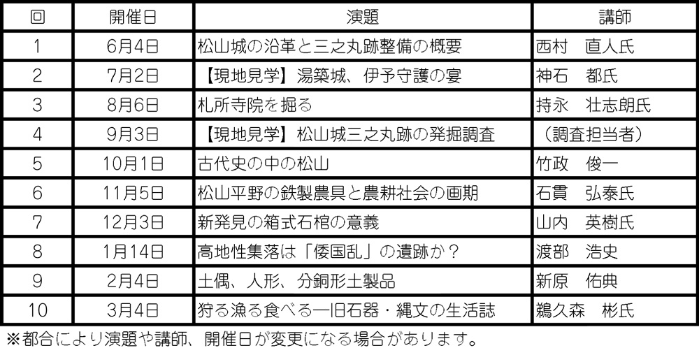 | 時 間:10:00~11:30 (受付9:30~) 資料代:1人1,000円 (10回分一括)※考古館観覧料は別途 定 員:60名 (応募多数の場合は抽選) 会 場:松山市考古館 講堂ほか 申 込:はがき・eメール・カルスポねっと 受付期間:4月15日(金)~5月12日(木)必着 |
