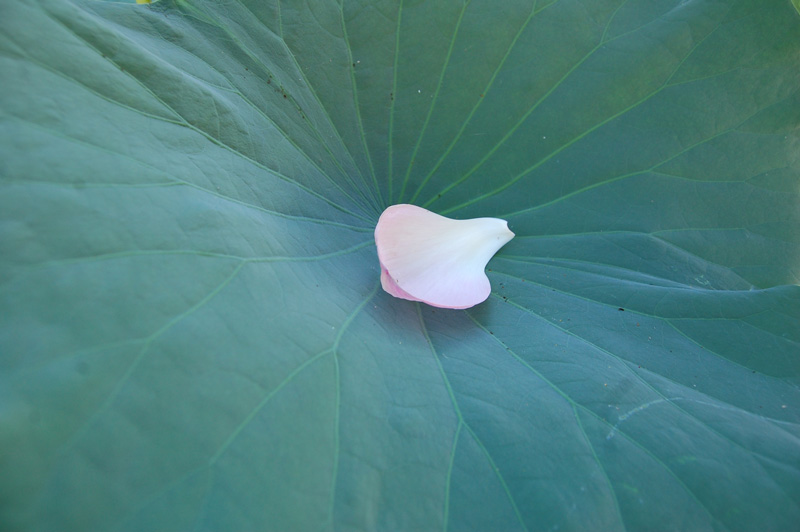 ハスの葉っぱの上に一枚の花びらが落ちていました。