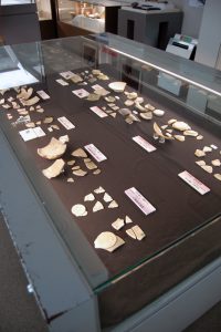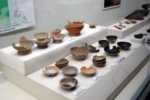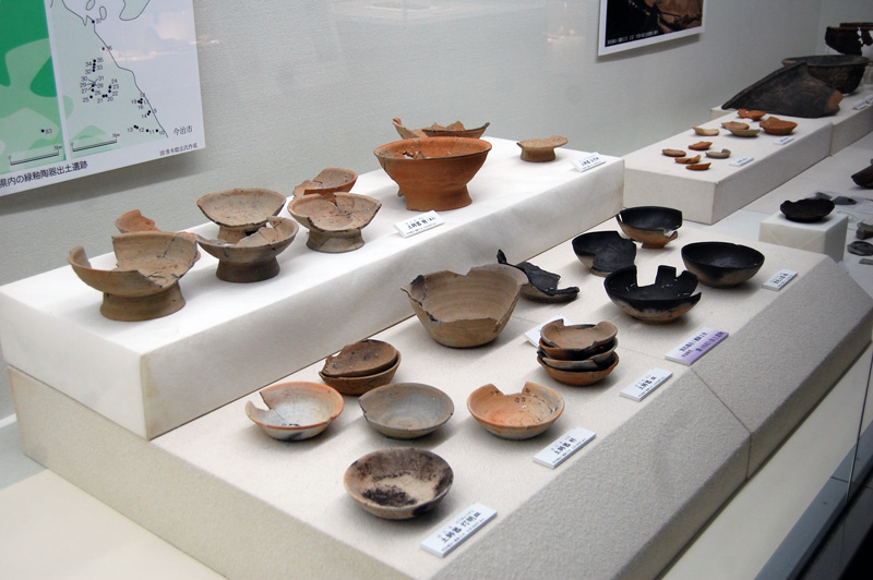 また、北竹ノ下1遺跡(西条市)から出土した縄文時代早期の押型文土器、弥生土器、中世の土師質土器や碁石、桜井遺跡(西条市)や紫宸殿遺跡(西条市)で出土した石包丁、土師器、土師質土器、陶磁器などについても展示・紹介しています。