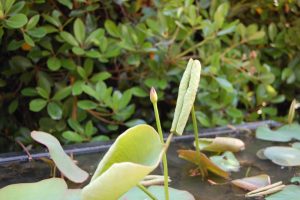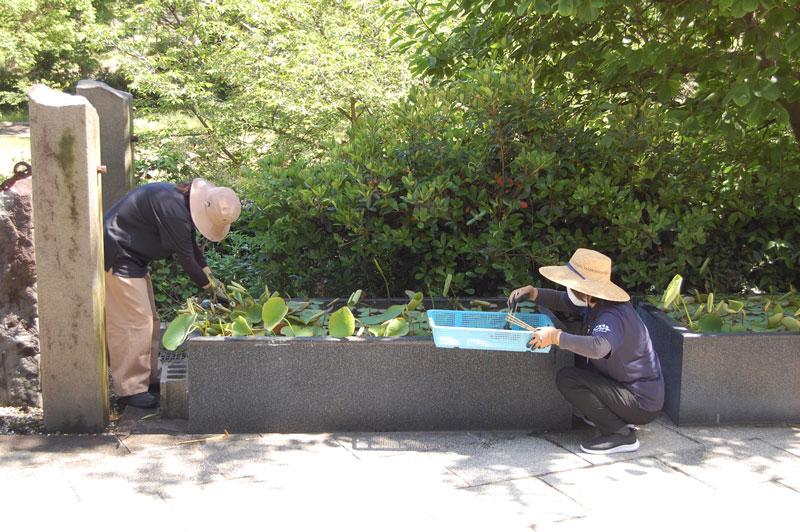 ハスの水槽に発生したコケや藻をとりのぞきました。