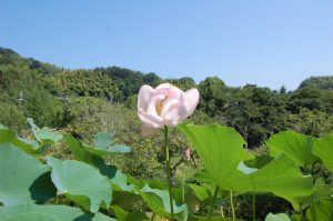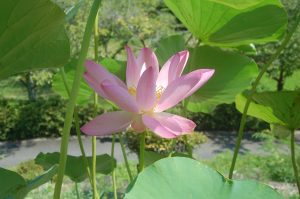 今日初日のハスが咲いています。葉っぱに隠れていました。
