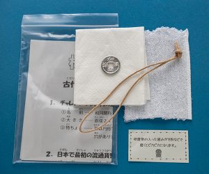 販売する教材は、①「石勾玉」(1セット300円)、②「合金みがき~ミニ銅鐸」(1セット700円)、③「合金みがき~ミニ銅鏡」(1セット500円)、④「合金みがき~銅銭」(1セット100円)のほか、通年で⑤「ふんどう君ペンダント」(1セット100円)があります。いずれも数量限定販売です。