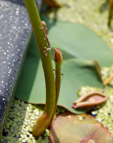水槽をながめていると、葉っぱにかくれて古代ハスのつぼみが・・・。