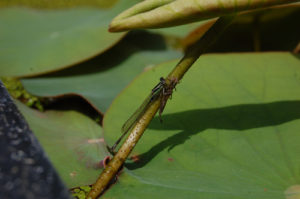 ご来館されたお客さんと一緒にまわりの観察をすすめると、すぐ近くにまもなく飛び立ちそうなイトトンボの姿をみつけました。