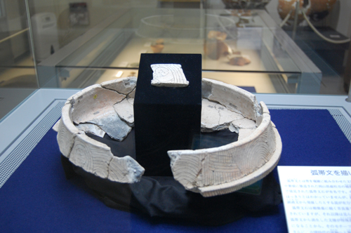 こちらは、新谷古新谷遺跡で見つかった、「弧帯文(こたいもん)」という特殊な文様が描かれた土器(壺の口縁部)です。県内初出土!!