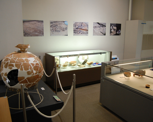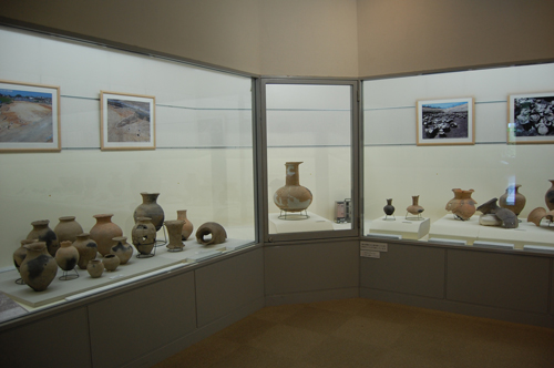 縄文時代後期の土器や、弥生時代後期の土器棺墓に用いられた壺やガラス小玉などを展示しています。