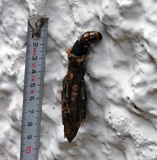 普通に見られるミノムシと比べると非常に大きいので、おそらくオオミノガの幼虫ではないかと思われます。