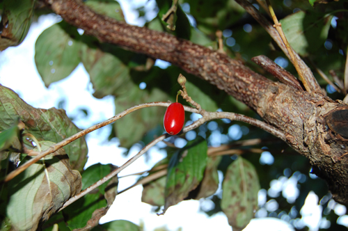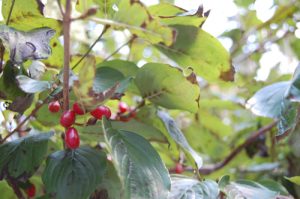 ふと上をみると、サンシュユに真っ赤な実がたくさんついていました。