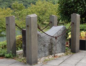 作品は三上浩さんの「遊行」をテーマに公開制作され、インド産の石柱と天城山(伊豆)の石、鉄の鎖により構成された空間には「時空の変化」が表現されています。
