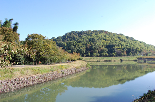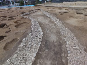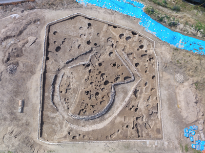 馬蹄形(ばていけい)の周壕(しゅうごう)をもち、周壕の内側と外側には石が貼り付けられていました。