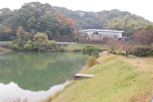 考古館の前には、大きなため池があります。