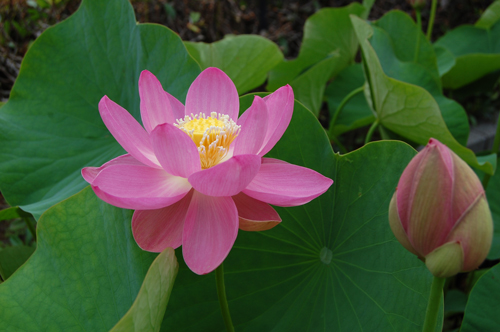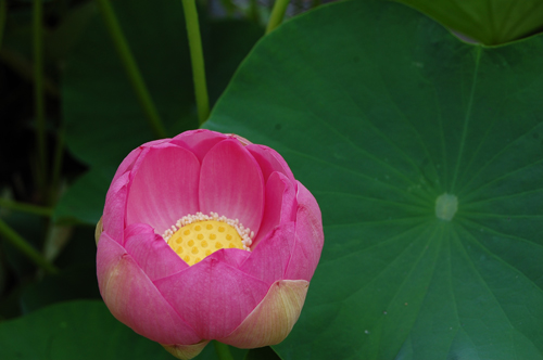 濡れたハスの葉に花が映えてとてもきれいです。