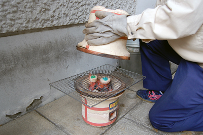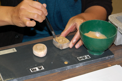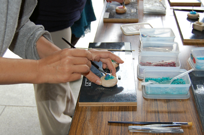 1.鋳型(いがた)にガラスがくっつかないように離型剤(りけいざい)を塗ります。