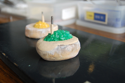2.ひもを通す穴をあけるために、離型剤をつけた鉄芯をたてます。