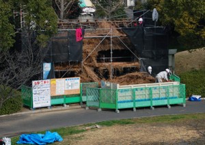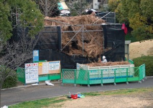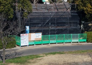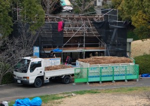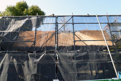 | 【内 容】 | 高床式倉庫のカヤ葺き屋根の改修をしている現地で、葺き替えの方法などを専門職員が説明します。 ※屋外での説明です。 |