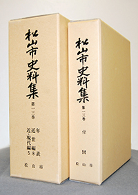 松山を中心とした年表、近世及び文化関係史料の補遺と、「松山市史料集」全十三巻の総目録を掲載。