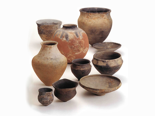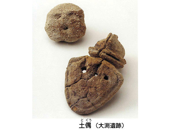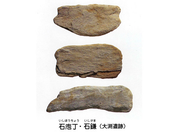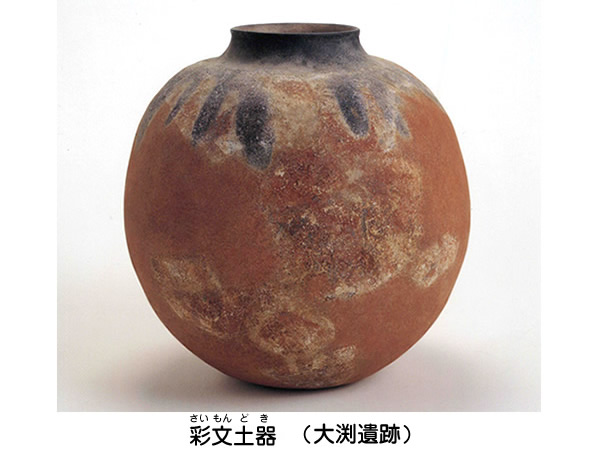 大渕遺跡からは、稲籾の圧痕が残る土器片や、 石庖丁、石鎌、 土偶、朝鮮半島出土の 彩文土器(さいもんどき)に類似した壷形土器が出土しています。